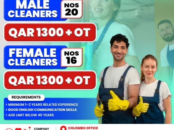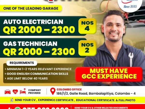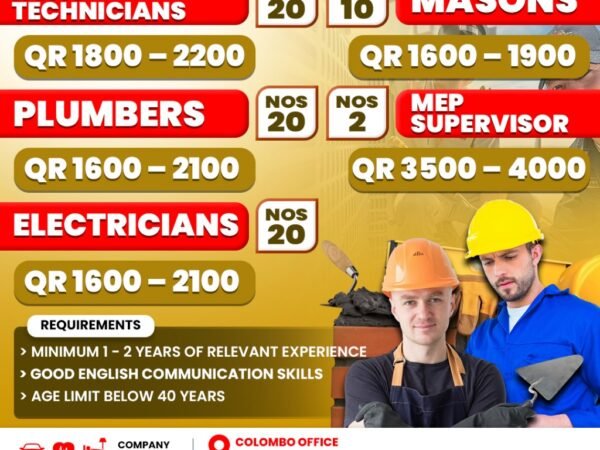 Vacancies in Qatar – HVAC Technicians (20) – QR 1800–2200 Masons (10) – QR 1600–1900 Plumbers (20) – QR 1600–2100 Electricians (20) – QR 1600–2100 MEP Supervisors (2) – QR 3500–4000