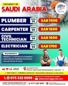 Lucky HR Solution (Pvt) Ltd, a government-approved recruitment agency since 2013, is pleased to announce immediate vacancies for skilled professionals to work in Saudi Arabia.